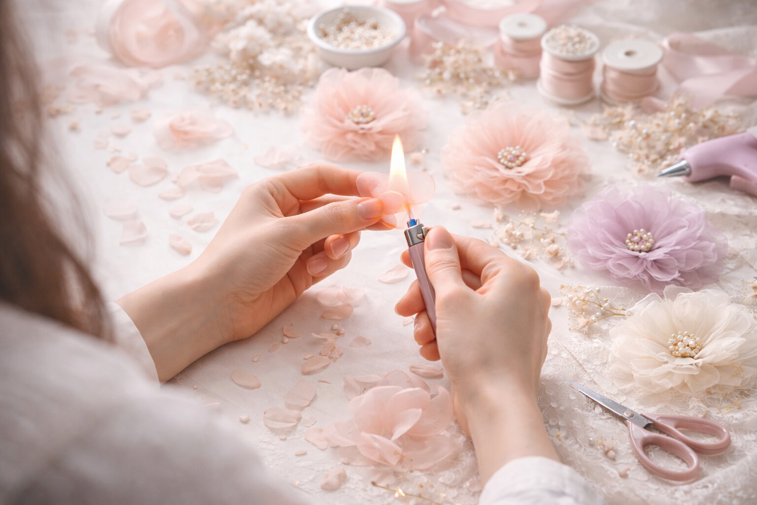 - Полиэстеровая органза - основной материал для цветоделия. Она доступна, имеет стабильную структуру и, что критически важно, плавится под воздействием тепла. Это позволяет обрабатывать края лепестков над пламенем свечи или горелки, запаивая срез и придавая ему естественный, слегка загнутый вид. Это основа популярнейшей техники.