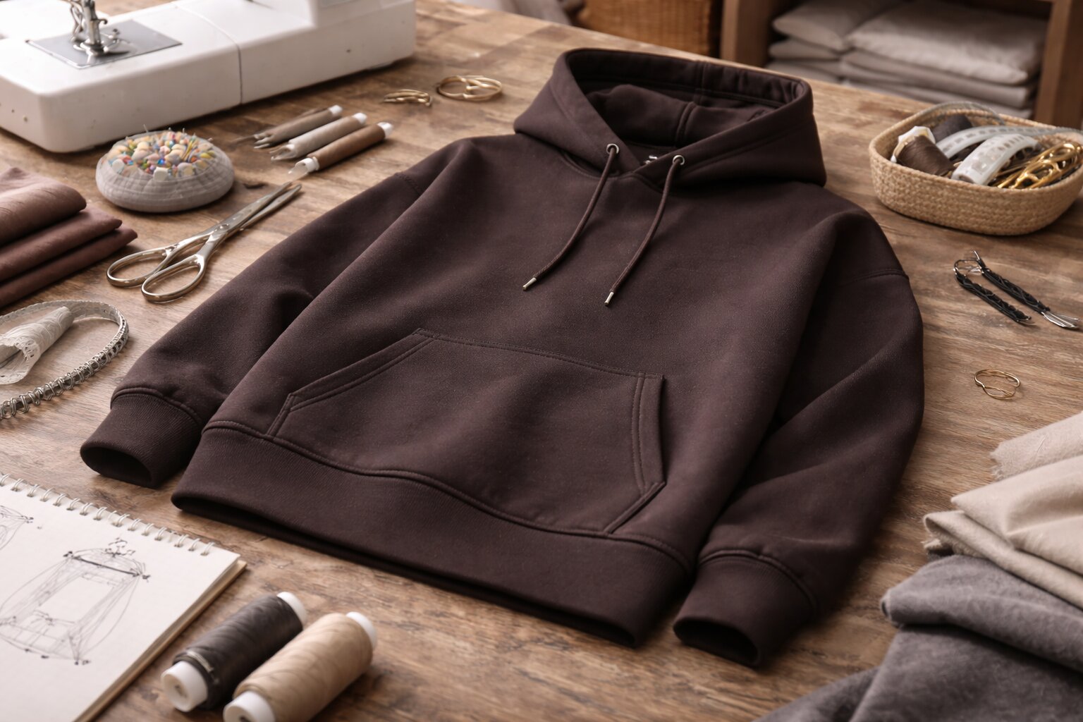 Для худи с капюшоном. Капюшон требует ткани, которая не будет бесформенно свисать. Слишком тонкая кулирка здесь часто проигрывает. Лучше взять футер двухнитку или стабильный интерлок средней плотности.