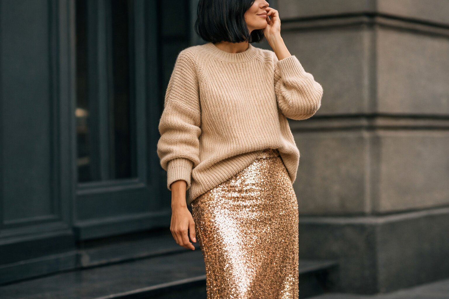 Исключение: Допустимы очень мелкие, почти незаметные блестящие акценты в аксессуарах (например, тонкая цепочка или ремешок на туфлях), если они перекликаются по цвету с пайетками.