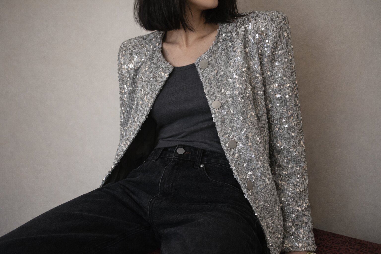 - Деним. Джинсовая куртка, тёмные джинсы-скинни или даже джинсовая рубашка - лучший способ «приземлить» пайетки и сделать их ношение уместным днём.