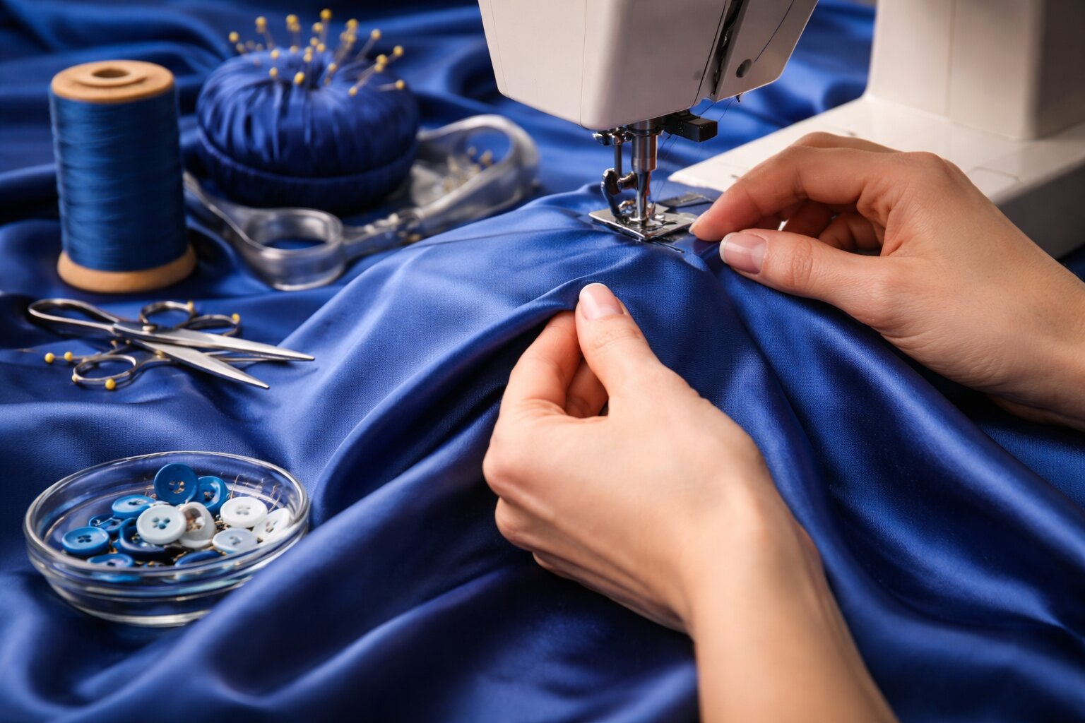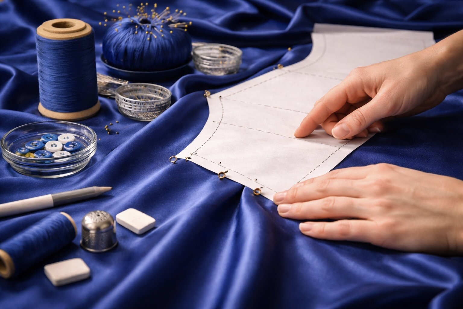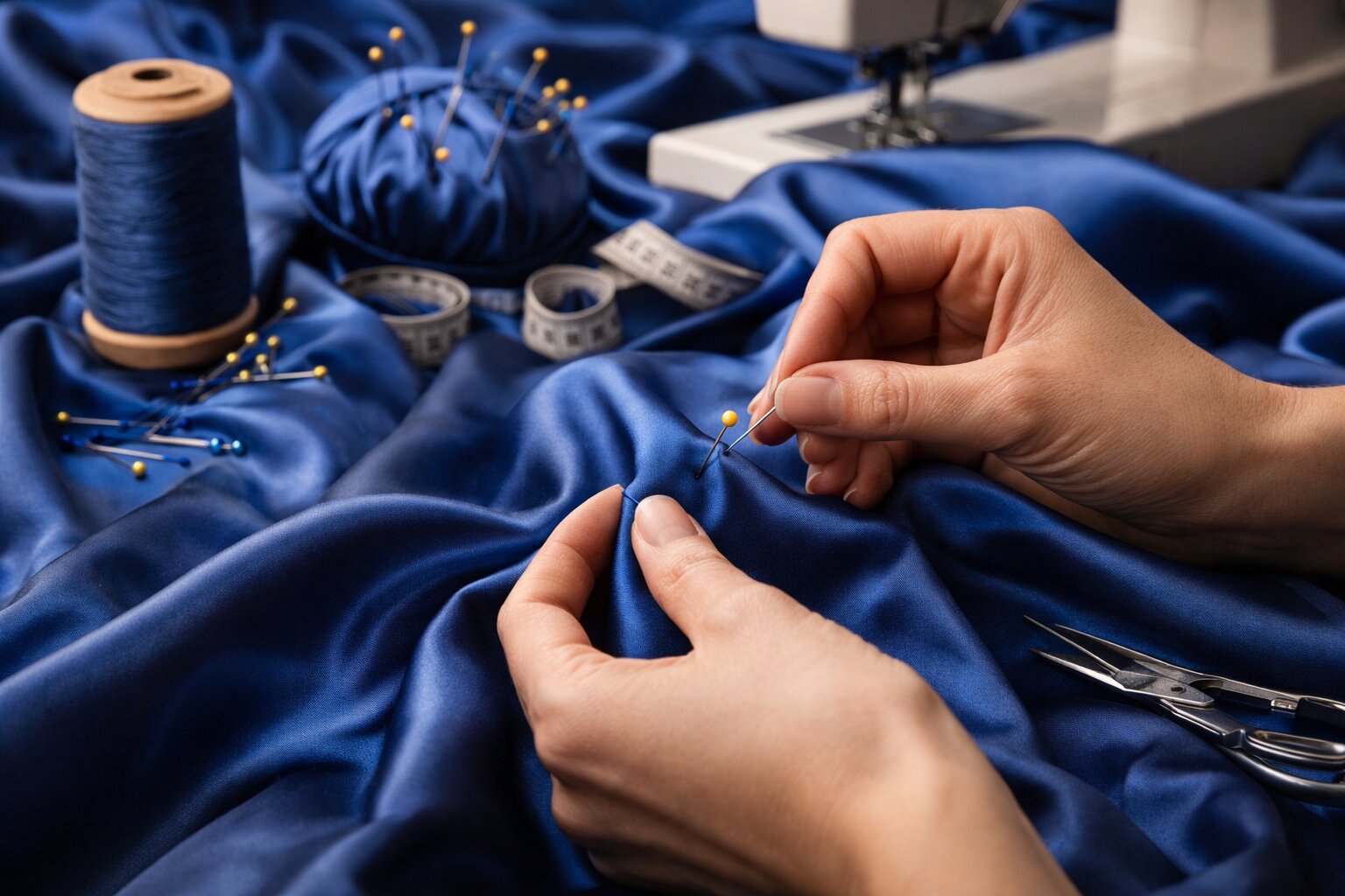 Именно поэтому атлас требует аккуратности на каждом этапе. Если хлопок позволяет где-то поторопиться, то здесь спешка сразу видна. Неровный шов, смещение деталей, лишний прокол булавкой - и ткань уже выглядит не так чисто, как хотелось бы.