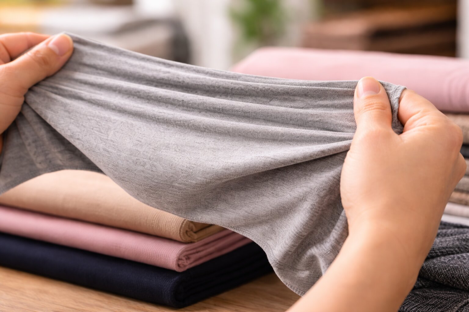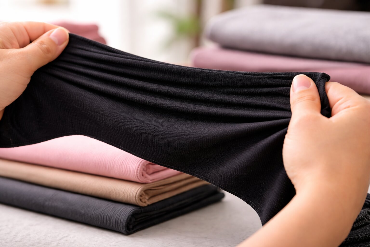- Проверяйте восстановление формы. Ткань должна не только тянуться, но и возвращаться обратно. Если после растяжения остаётся волна, в изделии это будет заметно.